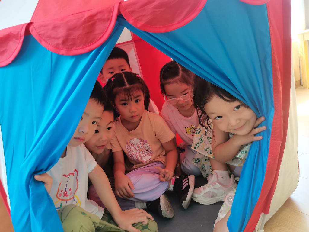 苒苒走进娃娃家区域,径直钻进蓝色和红色相间的帐篷里。她跪坐在帐篷内,双手扒着帐篷的边缘,她轻轻晃动着身体,提高声音说:“喂,你们想不想来我家做客呀?我是妈妈,我家里有好多好玩的!”她从帐篷里爬出来,走到那个小女孩身边,拉了拉她的衣袖,说:“你来嘛,我们可以一起给娃娃讲故事。”小女孩站起身,跟着苒苒走进了帐篷。苒苒回到帐篷里,和先来的小女孩一起摆弄着里面的布娃娃。过了几分钟,她又探出头:“你们搭的房子好高呀!要不要来我家做客?我家就在那个帐篷里,很近的。”这时,又有一个小朋友想钻进帐篷,帐篷里的空间有些挤了。苒苒看了看,站起来说:“我们可以分两批玩呀,先在外面玩一会儿‘小火车’的游戏,等一下再进来做客,好不好?”她拉起一个小朋友的手,做出开火车的动作,其他小朋友也跟着排起了队。