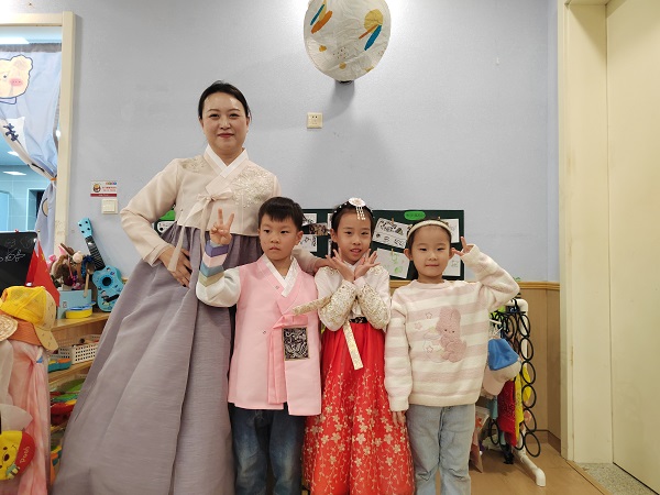 在互动环节,李佳玹妈妈还教孩子们学说了简单的朝鲜语问候,教室里洋溢着欢声笑语,孩子们在体验中感受着不同民族的文化特色。活动最后,大家与身着韩服的李佳玹妈妈及李佳玹一起留下了一张张灿烂的合影,为这次文化之旅画上圆满的句号。