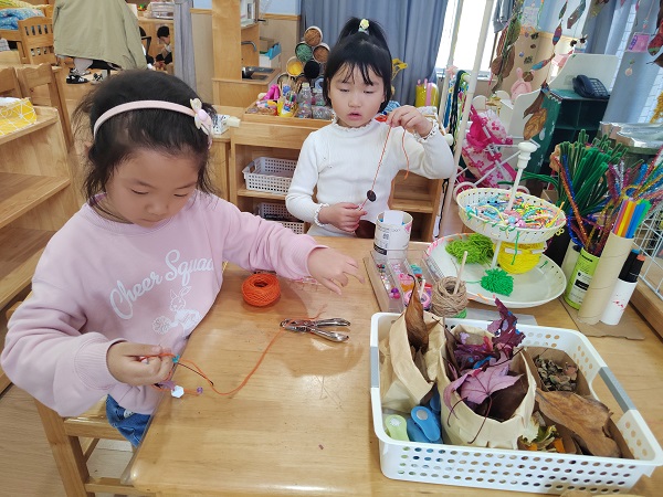 在大班生活区的手工台前,瑶瑶细心挑选大小均匀的无患子,放在垫板上排成一行;小艺把松针按三到五根一束理齐,用麻绳在根部轻轻扎好,整齐摆在旁边备用。瑶瑶拿起一根麻绳,对准无患子的天然小孔慢慢穿过去,拉直后隔一段距离打一个结固定;小艺在侧边及时递绳、拉紧,两人配合完成连续穿系,动作越来越顺。穿的过程中,她们一边目测间距,发现太近就主动拉开,让每颗无患子之间保持差不多宽,看起来更整齐、更有节奏。最后一颗无患子穿好后,小艺在底端系上小木环和小铃铛,轻轻一晃,发出清脆的声音。展示时,瑶瑶把作品举给同伴看,小艺口述步骤:“先挑无患子,再穿绳打结,最后加铃铛。”说完,两人一起把桌面材料归位,碎叶入筐,垫板擦干净,整个生活区又恢复整洁有序。
