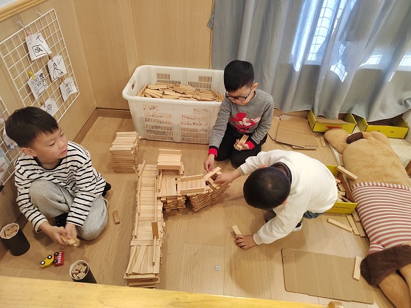 小奕先提出“搭一座能通车的桥”,两人用桥墩模板在地面比划跨度,决定桥长约60厘米、宽12厘米;小玮负责桥面,小奕负责桥墩与加固。