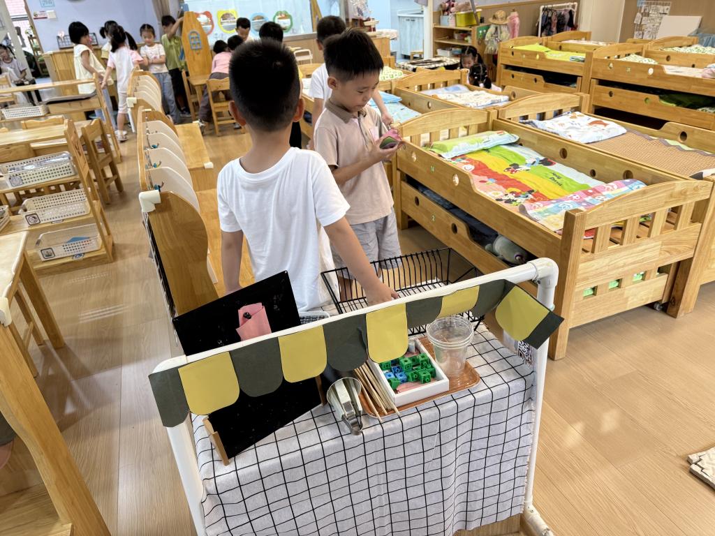小泽和嘉良并没有立即投入到烧烤店游戏材料的准备中。他们先是在各个游戏区之间来回走动,观察其他游戏区的活动情况。当老师注意到烧烤店区域尚未有人开始准备,并询问“怎么没人”的时候,小泽和嘉良才表明自己是小店员,随后开始动手准备游戏材料,将烧烤店布置起来。