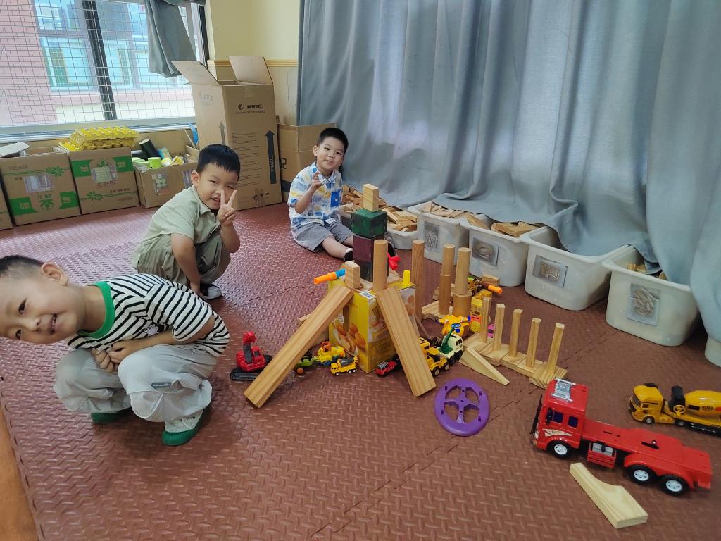 幼儿行为表现:幼儿们在建构区游戏中表现出浓厚的兴趣和高度的专注力。他们能够根据自己的兴趣和想法进行独立或合作搭建,展现出较强的创造性和想象力。