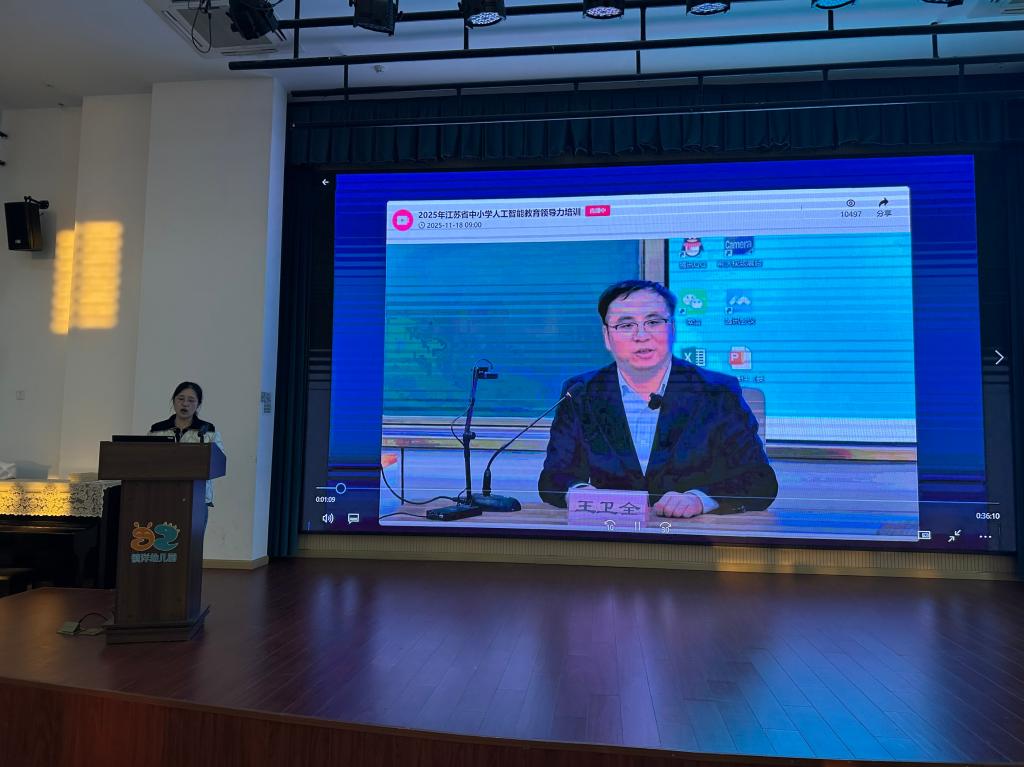 为深入贯彻落实江苏省教育厅关于人工智能赋能教育高质量发展的相关要求,全面提升教师队伍的人工智能素养与教育领导力,2025年11月20日,镇洋幼儿园在大会议室组织全体教师参与“2025年江苏省中小学人工智能教育领导力培训”线上学习活动,本次活动由潘瑜老师主持。此次培训特邀信息技术教研员王卫全作专题报告,为全体教师带来了一场前沿、实用的人工智能教育思想盛宴。