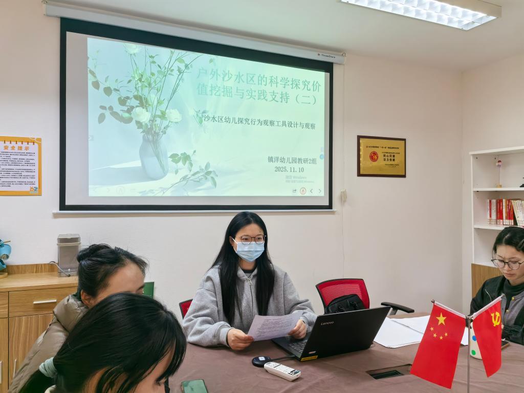 2025年11月10日,太仓市高新区镇洋幼教中心镇洋幼儿园教研2组在党建室开展以“户外沙水区的科学探究价值挖掘与实践支持”为主题的第四次教研活动,由金雨轩老师主持,教研2组全体教师参与。