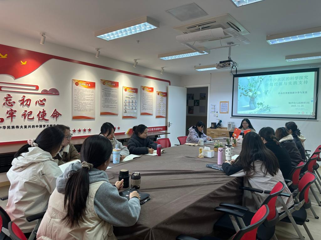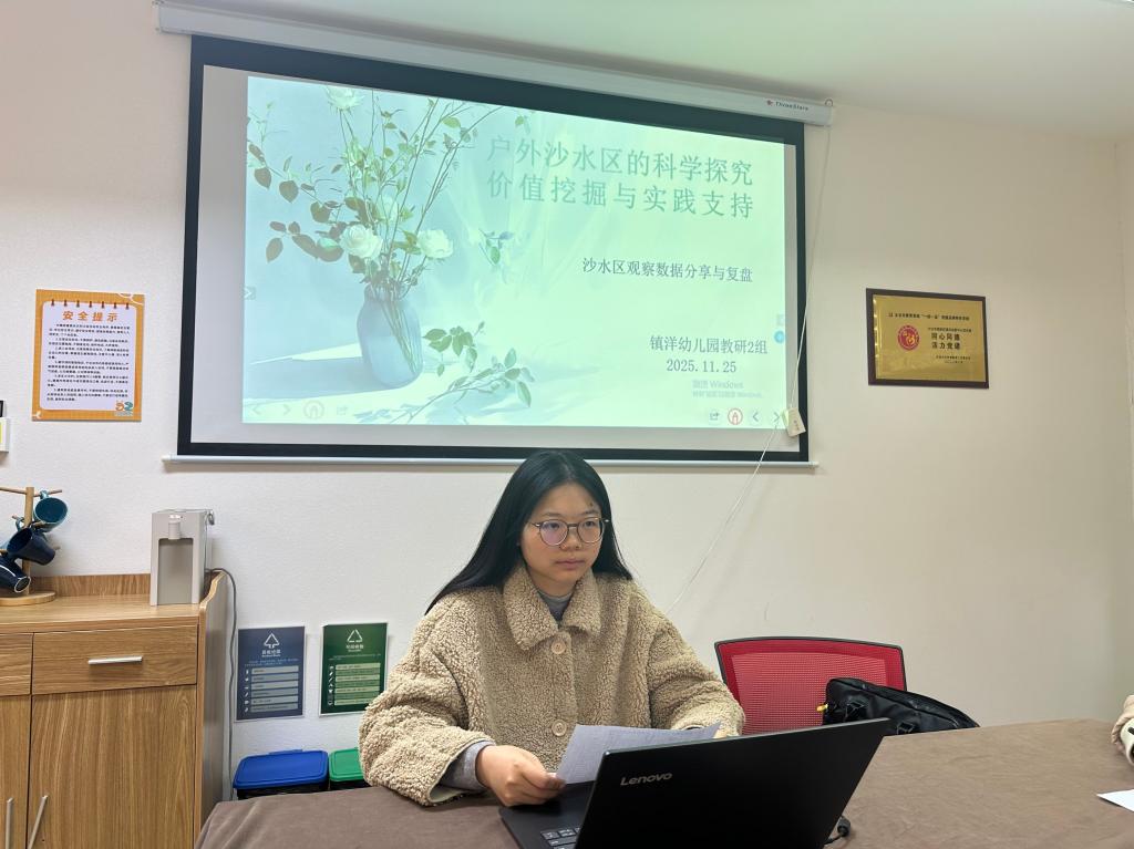 为深入挖掘户外沙水区的科学探究价值,优化幼儿游戏支持策略,2025年11月25日,太仓市高新区镇洋幼教中心镇洋幼儿园教研2组在党建室开展以“户外沙水区的科学探究价值挖掘与实践支持”为主题的第五次教研活动,由金雨轩老师主持,教研2组全体教师参与。活动聚焦沙水区观察数据分析与复盘,通过教师案例分享、集体研讨,探索科学教育新路径。
